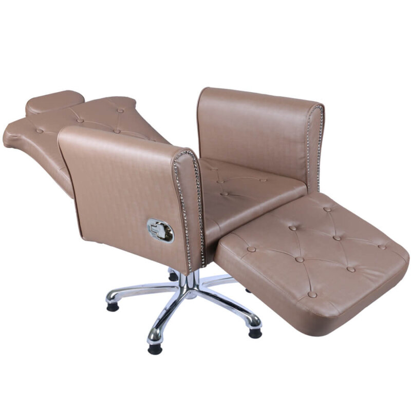 Cadeira no estilo poltrona, ideal para maquiar já que ela conta com reclino total e descanso de pernas embutido, sem contar a elegância que traz para seu espaço com os braços decorados com tachas.