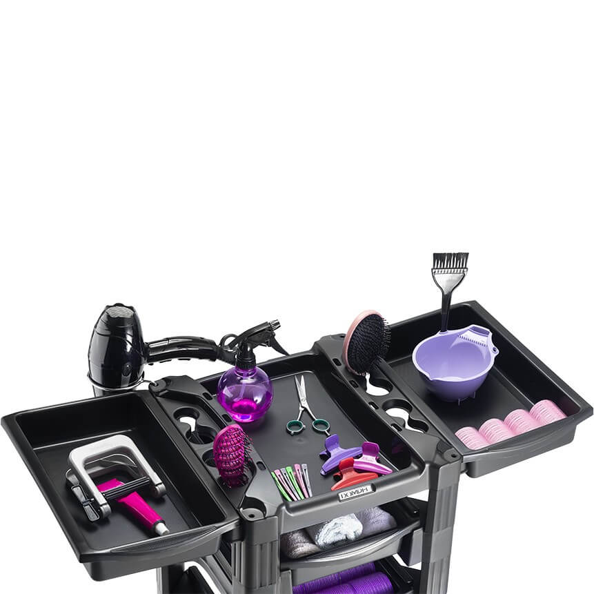 O design moderno e funcional do carrinho para cabeleireiro Vegas, ressalta dinamismo, charme e praticidade.