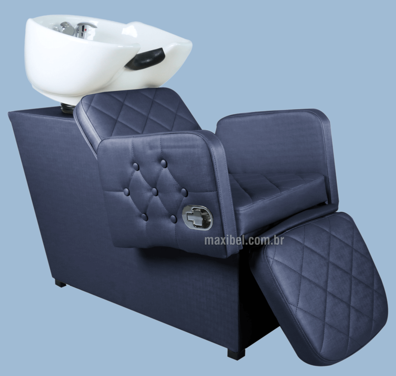 Lavatório de cabeleireiro com relax e cuba móvel em cerâmica . O assento e o encosto tem estilo quadrado, sofá, com partes internas com acabamento em matelassê e a parte externa dos braços com acabamentos em botonê. O encosto é fixo, porém é fabricado com um leve declínio, para que o cliente fique o máximo confortável ao lavar cabelo. A espuma usada no assento e encosto é de alta densidade e o revestimento é em curvim adequado para o uso comercial.