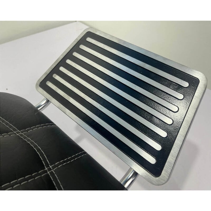 - Descanso dos pés com bordas em aço cromado e parte superior emborrachada.