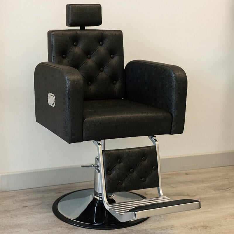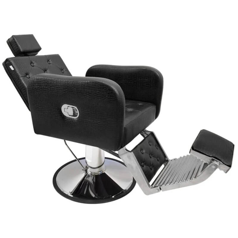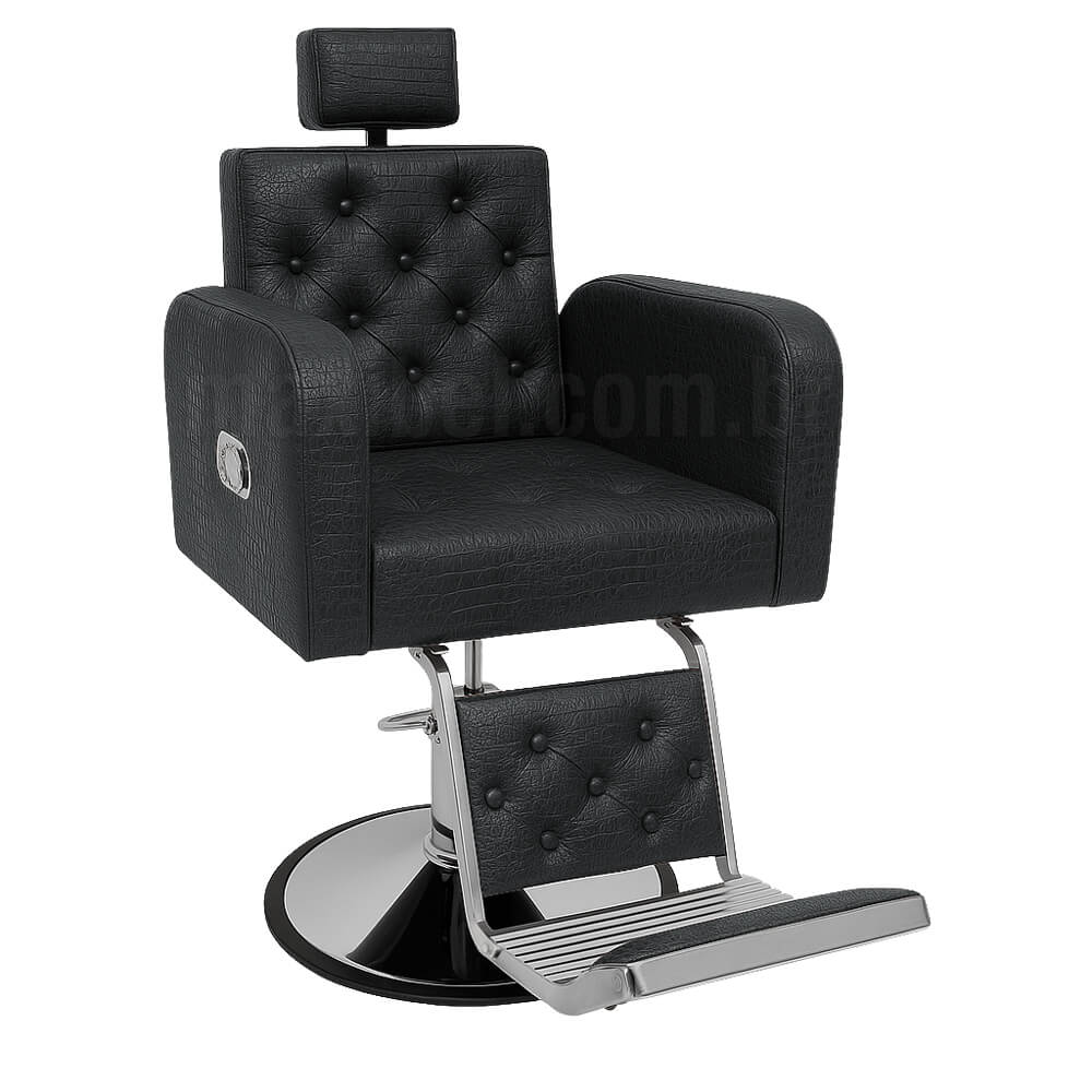 O assento, encosto e apoio para as pernas são acolchoados com espuma de alta densidade, proporcionando o suporte ideal mesmo durante procedimentos mais longos. O encosto tem inclinação suave e o apoio de cabeça é ajustável, facilitando o posicionamento do cliente em cortes, barbas ou outros serviços. A base redonda cromada com pistão hidráulico permite ajuste de altura com estabilidade, enquanto o apoio de pés cromado garante uma postura confortável e segura.