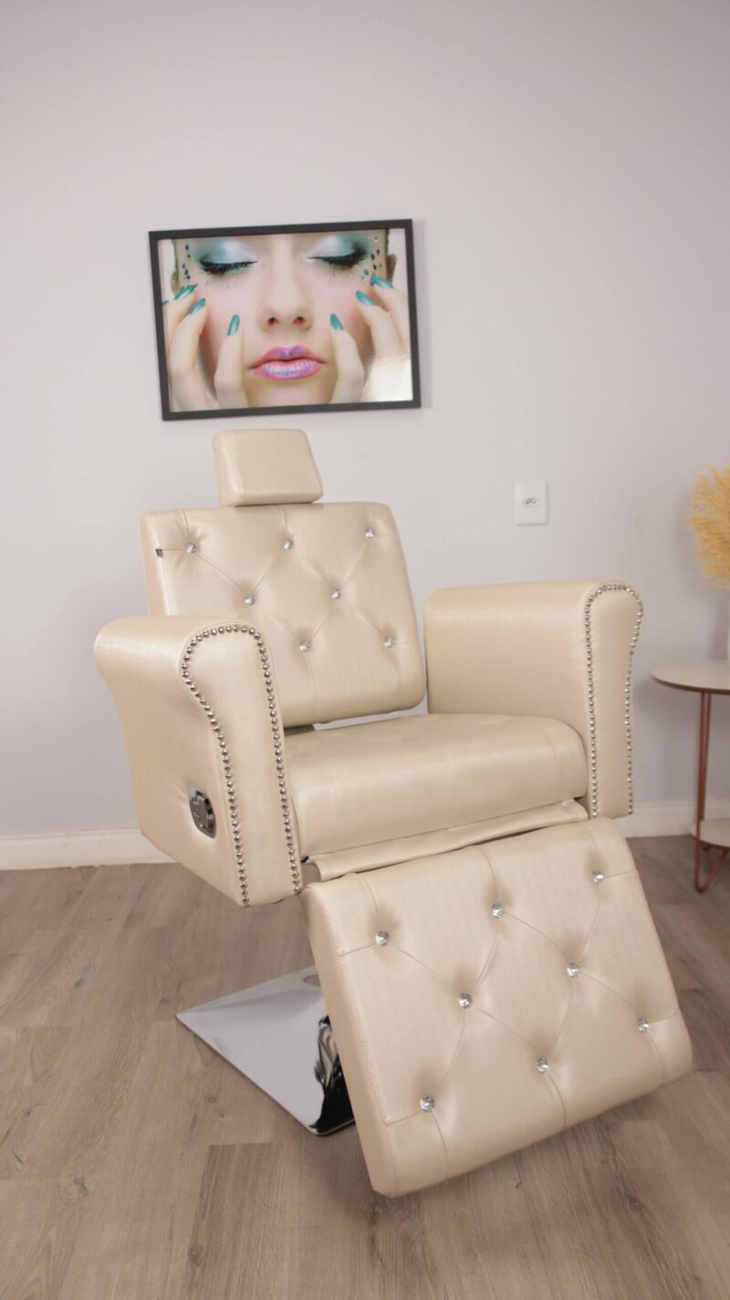 Esta elegante cadeira de maquiagem reclinável apresenta um design moderno e sofisticado, ideal para salões que buscam conforto para o alto giro de clientes. Com uma base quadrada giratória e ajustável, oferece praticidade total no posicionamento. O assento e encosto são confeccionados em espumas de alta densidade, revestidos com courvin durável, garantindo conforto e uma fácil manutenção. O apoio de cabeça ajustável e removível permite personalizar o suporte conforme a necessidade do cliente. Além de funcional, esta poltrona destaca-se pelo acabamento de alta qualidade, agregando um toque de luxo e sofisticação ao ambiente.