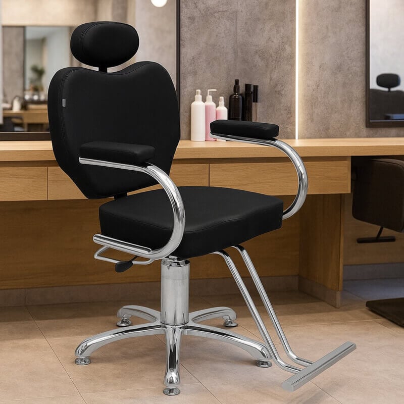 Esta cadeira reclinável de salão é robusta construída com uma estrutura de aço compensado de carbono, oferecendo durabilidade e estabilidade. O assento e o encosto são projetados anatomicamente, contando com uma espuma laminada de alta qualidade e densidade de 28, garantindo máximo conforto durante o uso. Possui um encosto reclinável e um sistema de ajuste hidráulico que permite modificar a altura com suavidade e precisão. O cabeçote ajustável oferece suporte ideal para a nuca, melhorando o conforto do cliente e o trabalho do cabeleireiro. A base é de aço carbono cromado, complementada por um sistema de nivelamento nos pés e borrachas antiderrapantes que garantem segurança e estabilidade. O revestimento em tecido curvim não só acrescenta um toque de elegância e facilidade na limpeza, mas também assegura durabilidade.