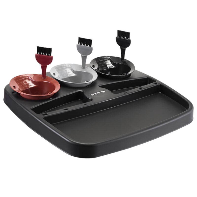 Tampo: Acompanha 3 tigelas com 3 pincéis. Tampo amplo e bem dividido, com compartimento para acessórios e tigelas;