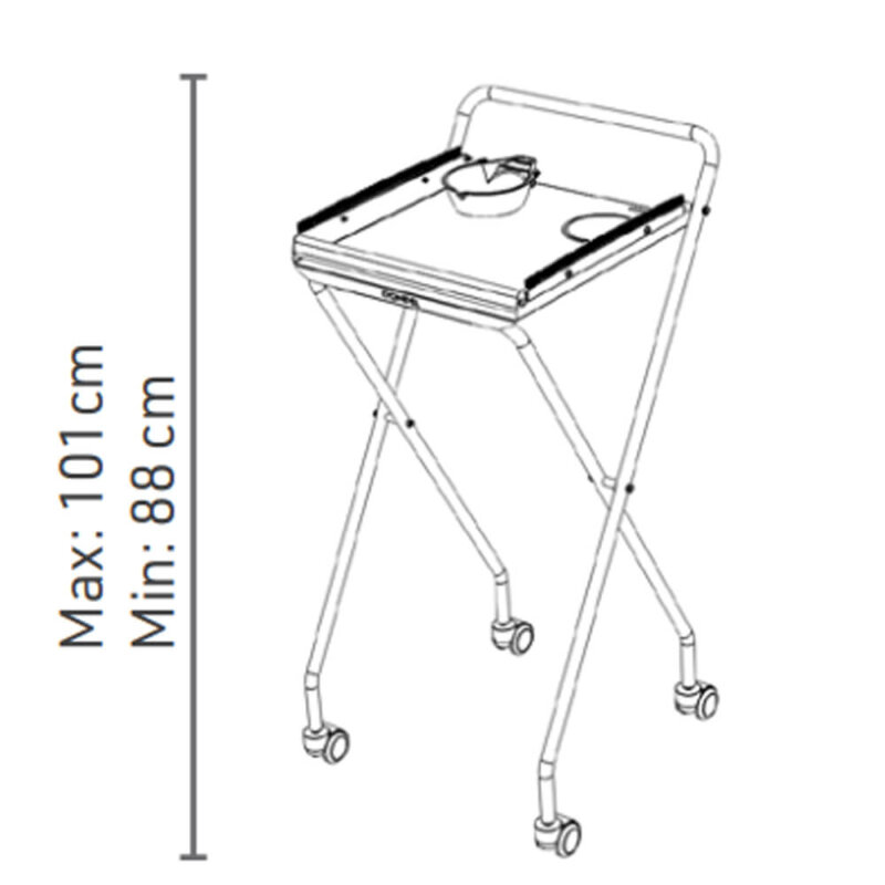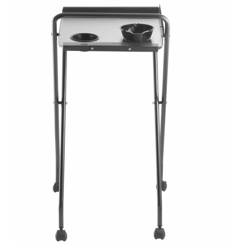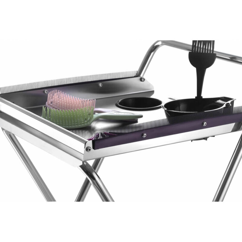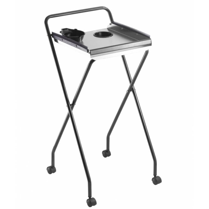 Carrinho auxiliar retrátil, leve e funcional, perfeito para profissionais que buscam praticidade e organização. Equipado com uma resistente bandeja de aço inox escovado, oferece duas tigelas para coloração e compartimentos bem posicionados para armazenar acessórios, tornando-o ideal para serviços de coloração. Disponível em duas versões: estrutura em aço cromado ou na cor preto ônix, ambas combinadas com a durabilidade do aço inox.