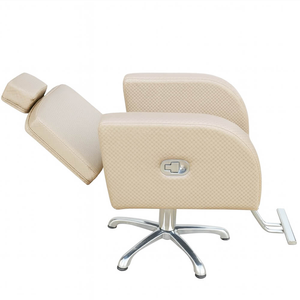 O assento e o encosto, ambos acolchoados com espuma laminada de alta qualidade. Sistema de regulador de altura no cabeçote, que permite um apoio adequado à nuca, adaptando-se aos clientes. A estrutura em alumínio, resistente à oxidação, protegendo a cadeira contra o desgaste do tempo. Conta com apoio de pés central que ajuda no conforto do cliente.