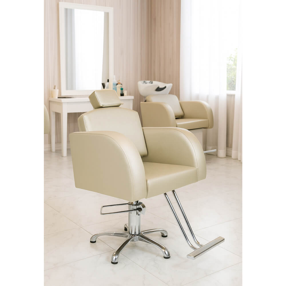 Este modelo de cadeira para corte de cabelo destaca-se pelo seu revestimento em courino, um material elegante e facil de limpar. Equipada com um sistema de elevação hidráulico, esta cadeira oferece a possibilidade de ajustar facilmente a altura, garantindo um posicionamento suave e preciso, ideal para atender serviços como cortes e coloração.