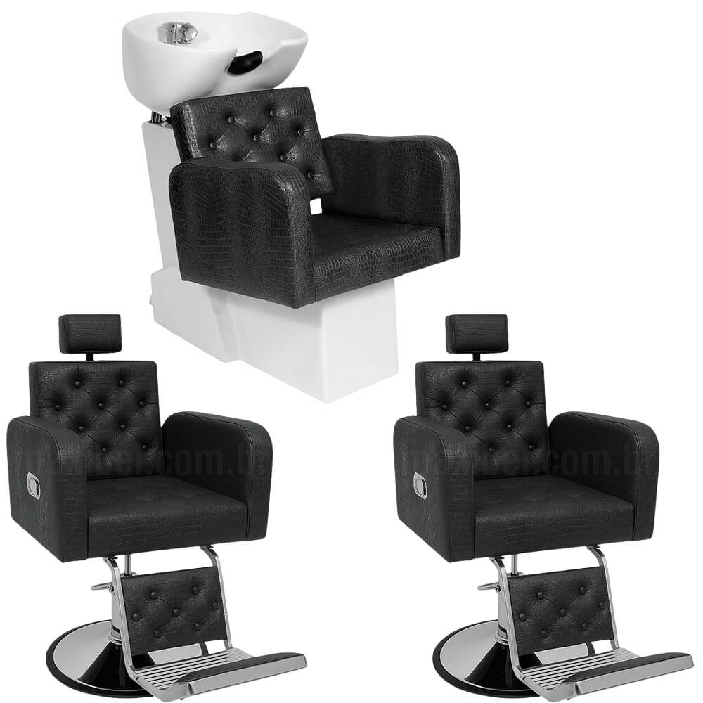 Poltrona e lavatório para barbeiros da linha Tokyo, esse kit conta com 2 cadeiras reclináveis e 1 lavatório com cuba de louça, ambos com tecido croco.