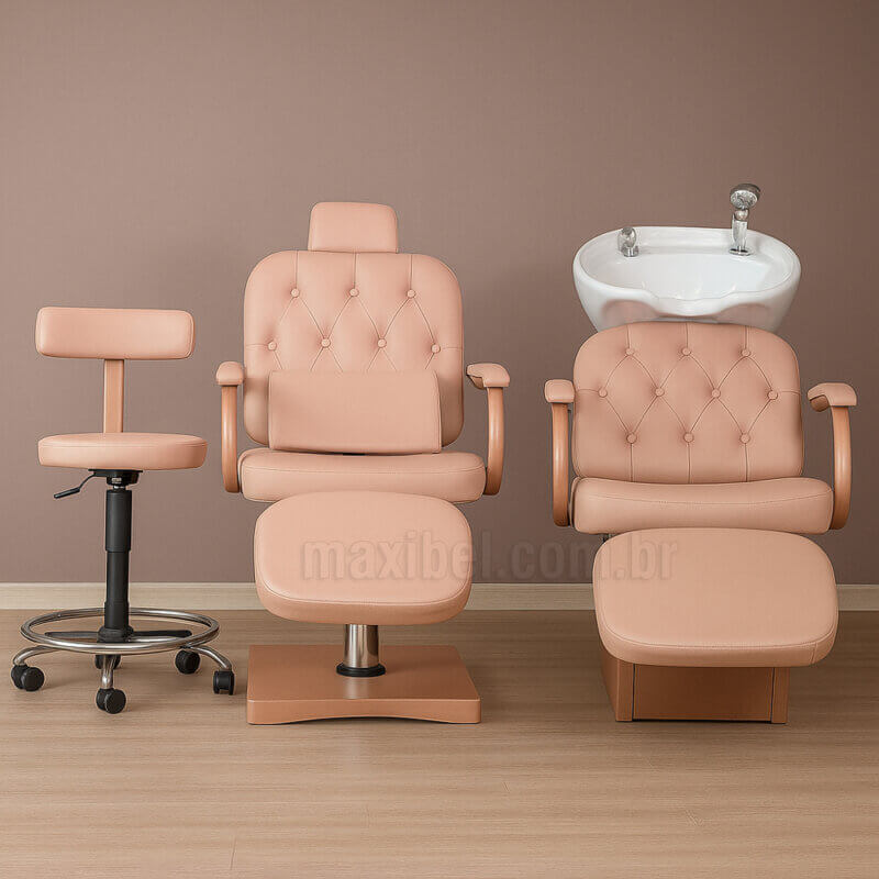 O kit Salão Rose Beauty é composto por 1 cadeira reclinável com descanso de pernas, 1 lavatório com cuba de porcelana e 1 mocho com encosto, todos com acabamento na cor rosé e revestimento com costura dupla. É uma ótima escolha para quem quer oferecer um atendimento de qualidade com um visual elegante.