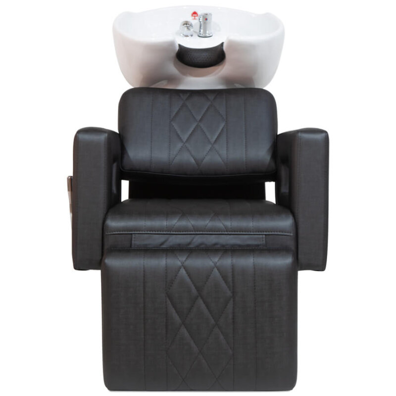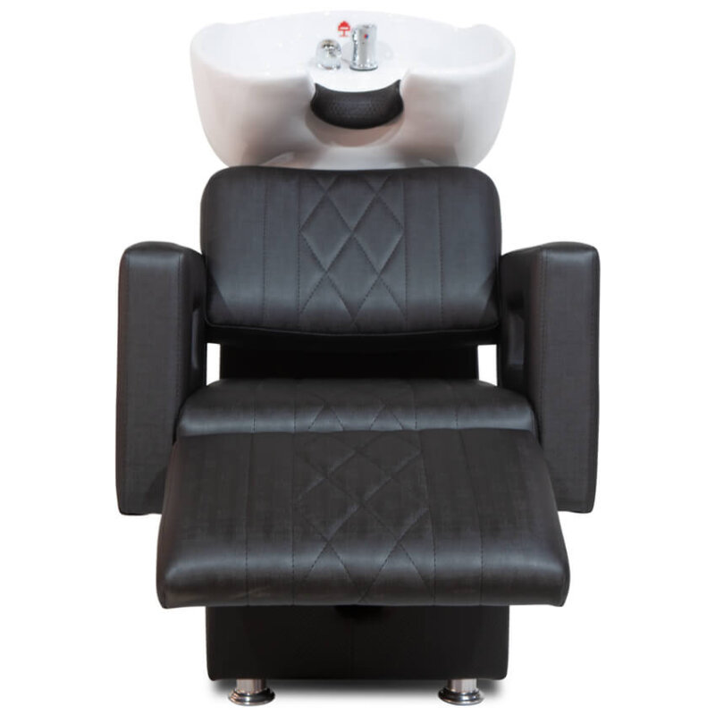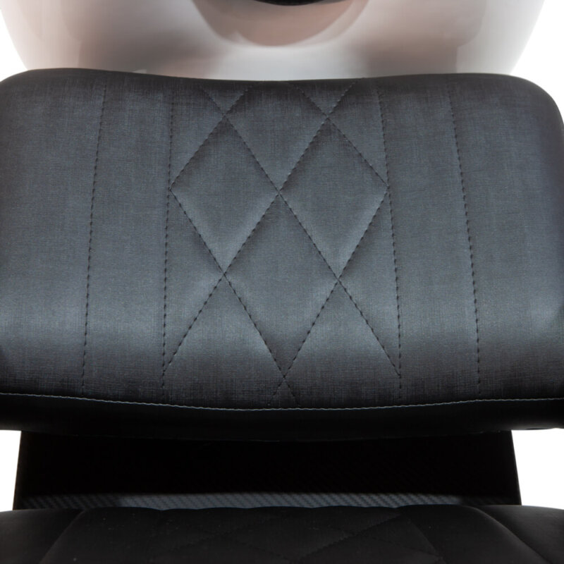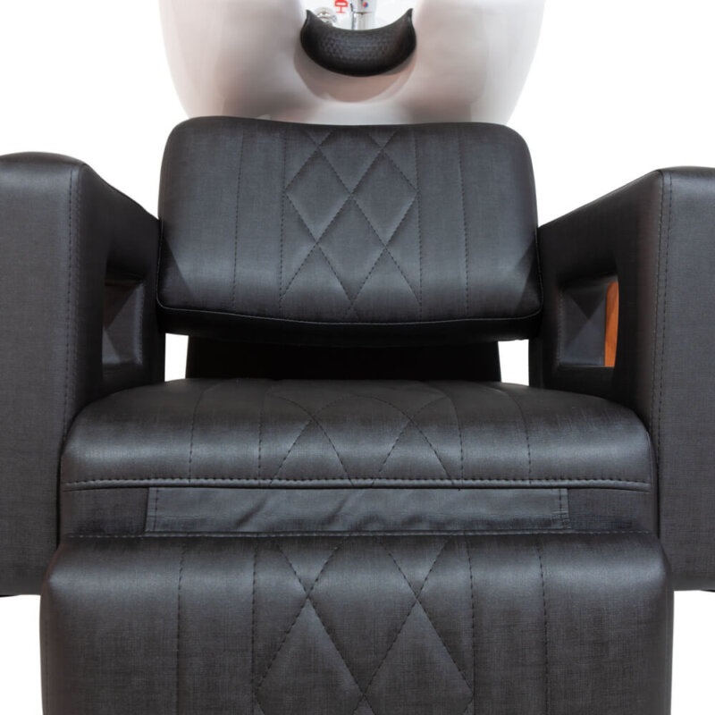 Lavatório de cabelo com braço em madeira e suporte de pernas, proporcionando mais conforto para o cliente. Todo revestido em courvim com detalhes na costura de primeira mão tanto na parte externa e interna. Na parte externa temos esse desenho ao longo do lavatório, que se chama matelassê, que entrega esse belo visual. Já na parte interna, toda costura é dupla, dando mais resistência e qualidade, o que faz esse lavatório ser ideal para o auto giro de clientes. Esse Lavatório para salão conta também com: