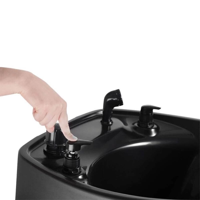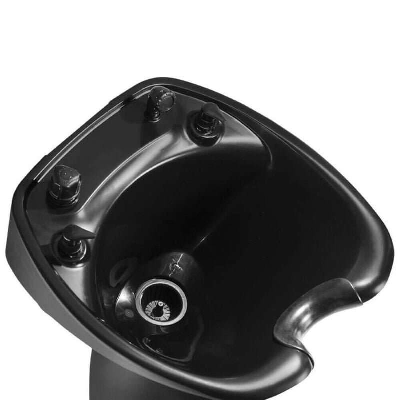 O lavatório de cabelo Square, feito em polímero injetado resistente, oferece cuba profunda, frascos removíveis e apoio de braços vazado.
