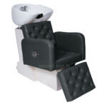 O Lavatório Tokyo com descanso de pernas conta com acabamento em preto e detalhes em capitonê no encosto e no apoio de pernas. A cuba em porcelana preta possui mecanismo de regulagem de altura, permitindo melhor adaptação à posição do cliente e proporcionando mais conforto durante o atendimento. O registro misturador monocomando possibilita controle preciso da temperatura da água, garantindo praticidade no dia a dia do profissional.
