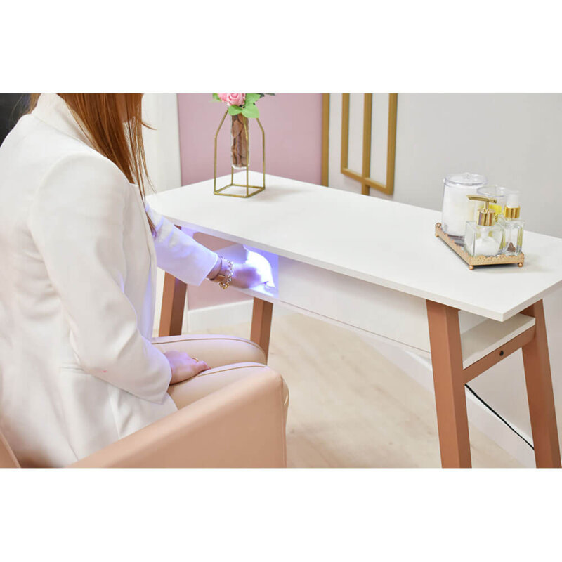 A estrutura da Mesa França para Manicure é em aço carbono tubular SAE 1020, revestido em pintura eletrostática epóxi. O gaveteiro é em MDF de 15mm de espessura, com gaveta em trilho telescópico. Possui um nicho para cabine de unhas. Desta forma a manicure tem uma mesa com um design muito diferenciado e prático, com todo o material de trabalho com fácil acesso.