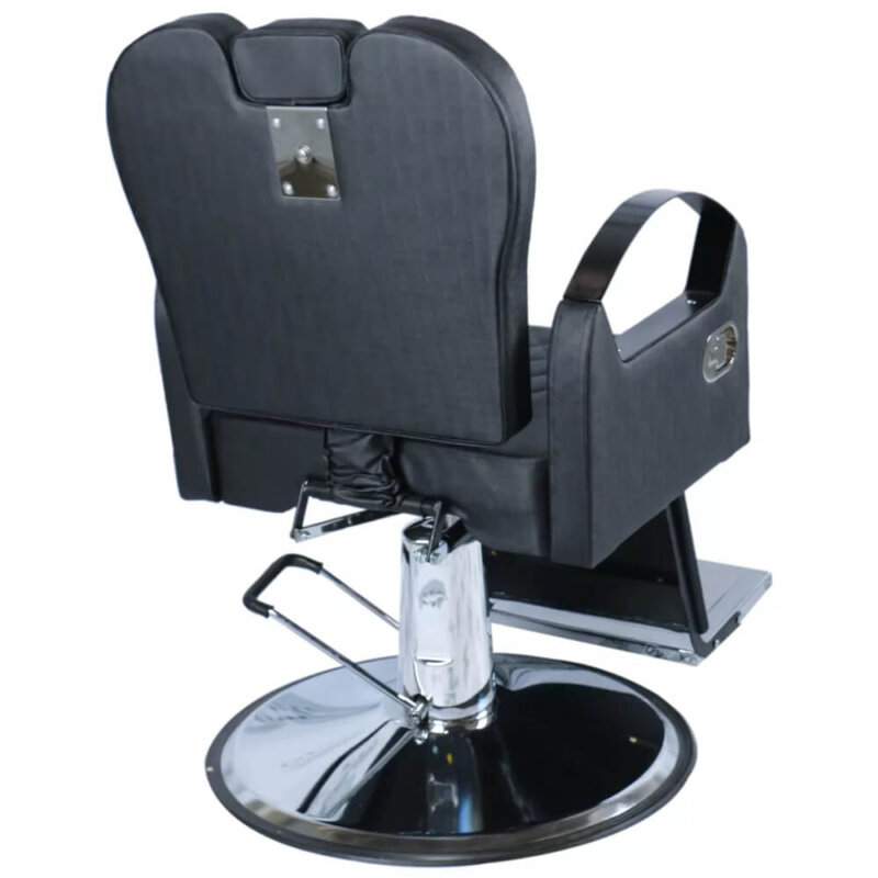 Poltrona de barbeiro com detalhes em preto e base cromada, com ajuste de altura e sitema reclinável.