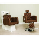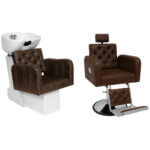 Poltrona e lavatório para barbeiros da linha Tokyo, esse kit conta com cadeira reclinável e lavatório com cuba de louça, ambos com tecido croco.