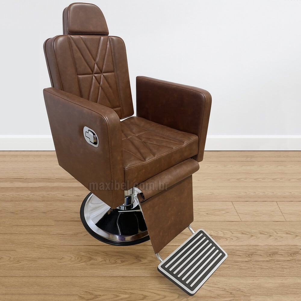 Seu revestimento em courvim com textura discreta e costuras decorativas em padrão geométrico reforça o visual moderno e profissional da poltrona. O encosto conta com sistema de inclinação suave, ideal para cortes, barbas e outros atendimentos.